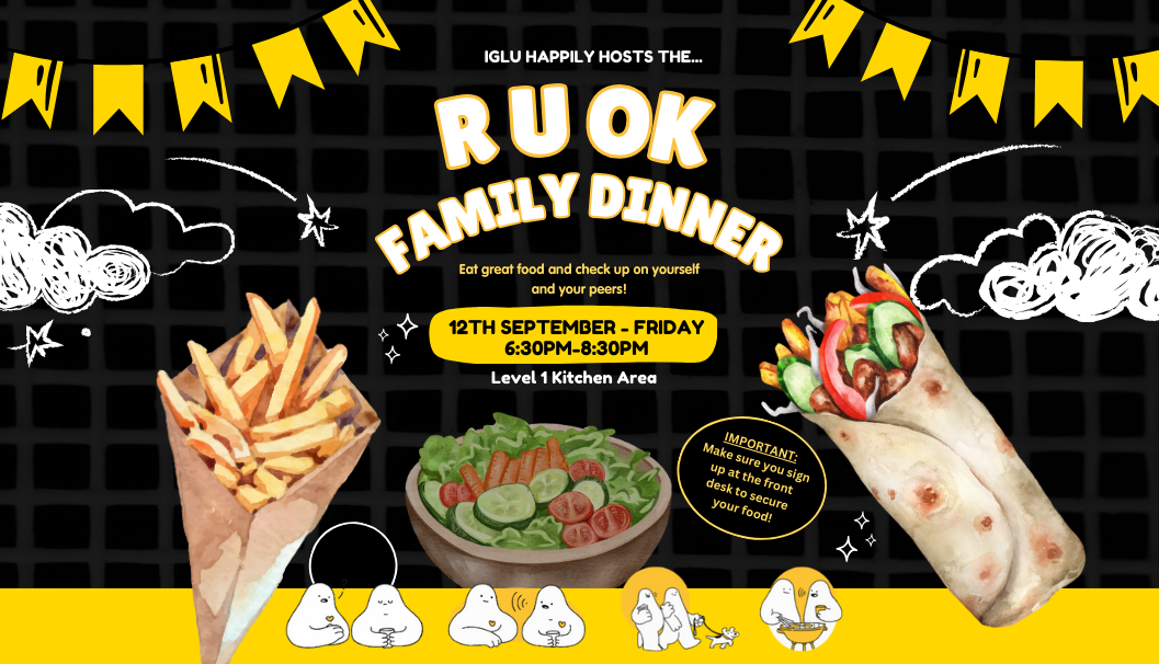 Residents are invited to touch base with yourselves as well as the friends around you within the building. R U OK helps bring light to normalising conversations around mental wellbeing. This is a dinner catered to feeding you a great meal whilst having greater conversations about how you are going!😊