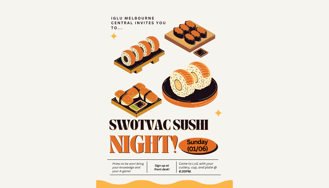 Come celebrate the end of the semester and eat your worries away with some sushi at Iglu Melbourne Central’s SWOTVAC Sushi Night! There will be prizes available to win, so make sure to bring your cutlery, plate, cup, AND your absolute A-game!